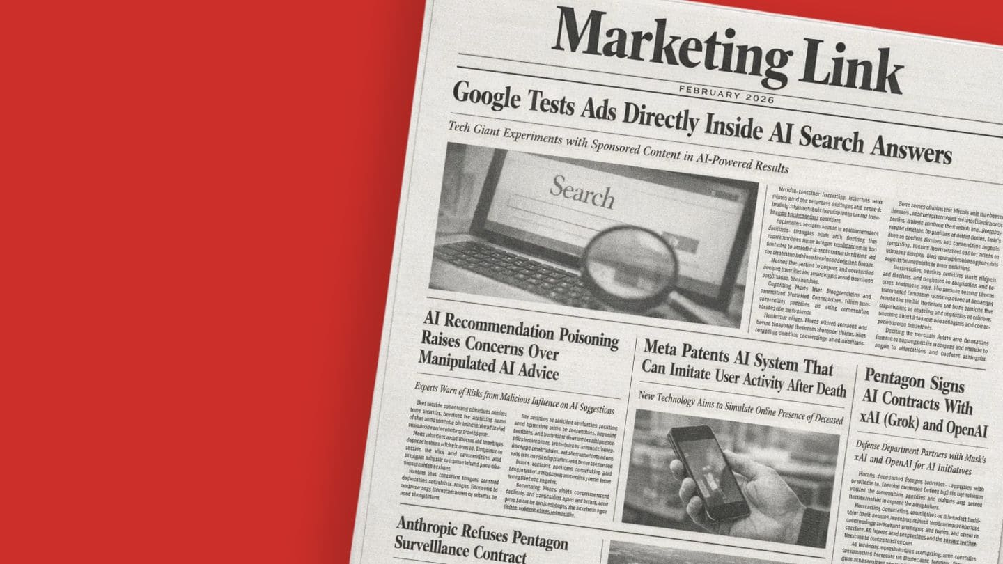 Marketing Link собрал самые интересные новости за февраль: реклама прямо в ответах AI от Google, токсичные AI-рекомендации, Meta создает AI-клона, который имитирует активность пользователя после смерти, противостояние Anthropic Пентагону и военные контракты xAI (Grok) и OpenAI (ChatGPT).