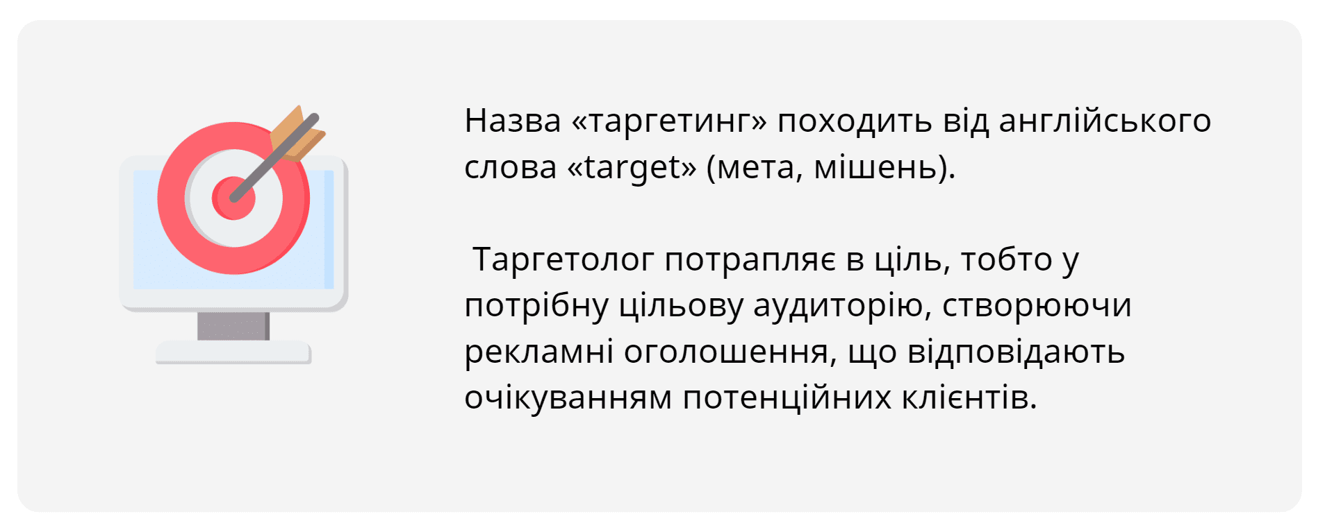 Назва «таргетинг» походить від англійського слова «target» (мета, мішень), Таргетолог потрапляє в ціль, тобто у потрібну цільову аудиторію, створюючи рекламні оголошення, що відповідають очікуванням потенційних клієнтів.