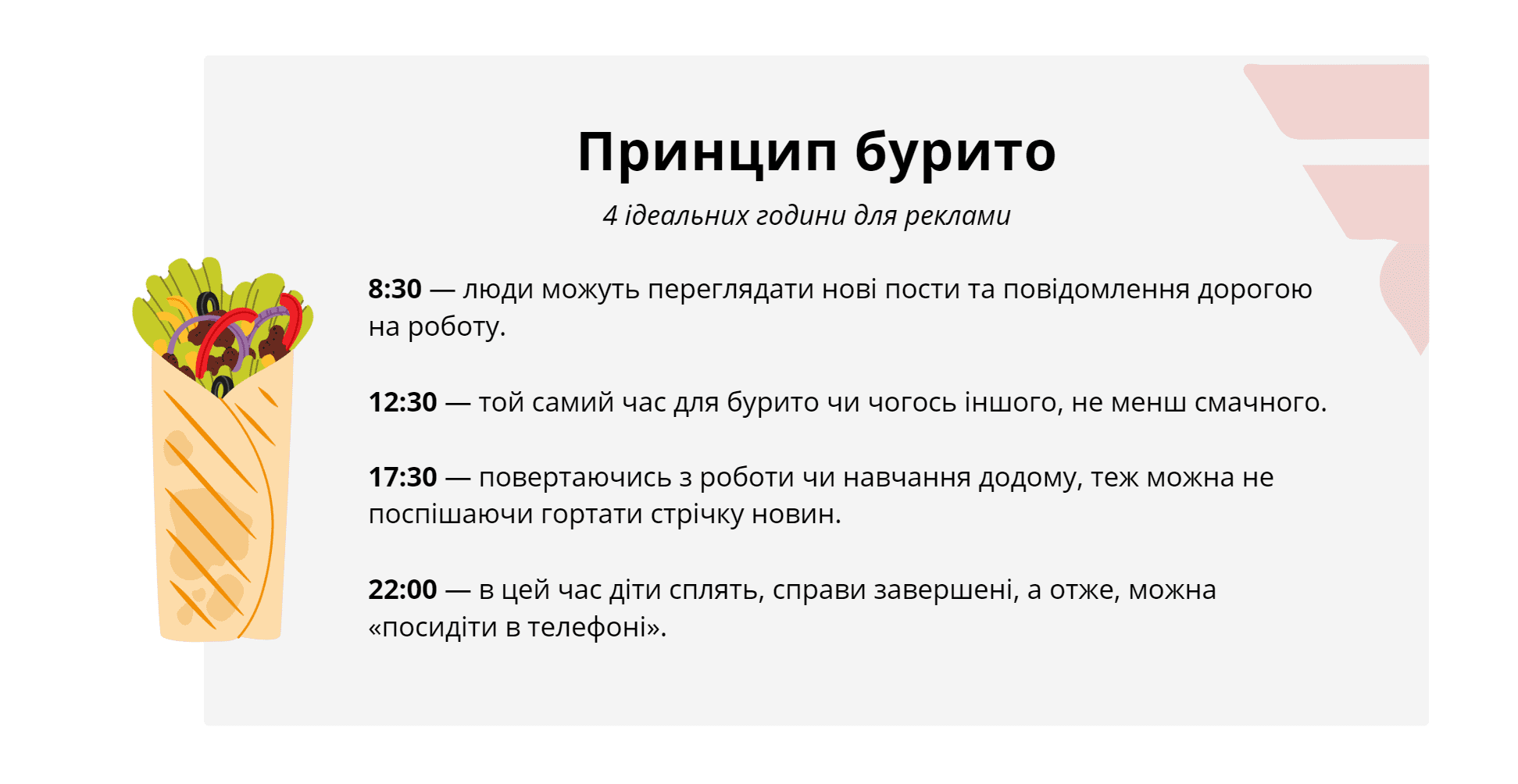 - Принцип бурито допомагає підвищувати активність підписників у соцмережах, отримувати більше переглядів електронних листів і повідомлень у месенджерах та переходів за посиланнями. При цьому кількість контенту та його якість можуть залишатися такими, як і раніше. Головне — зрозуміти, коли ваш потенційний покупець їсть бурито.