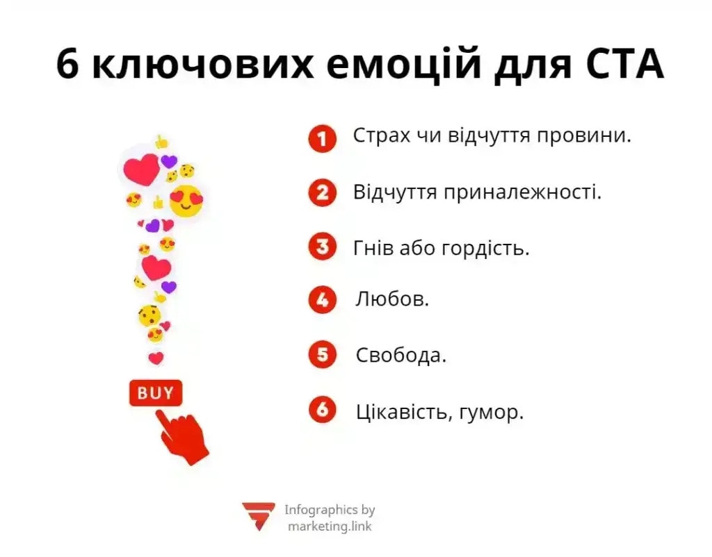 Отже, ефективний заклик до дії неможливо створити без розуміння цільової аудиторії та уміння працювати з емоціями споживачів. Існує 6 ключових емоцій, вплив на які може покращити результати застосування CTA.